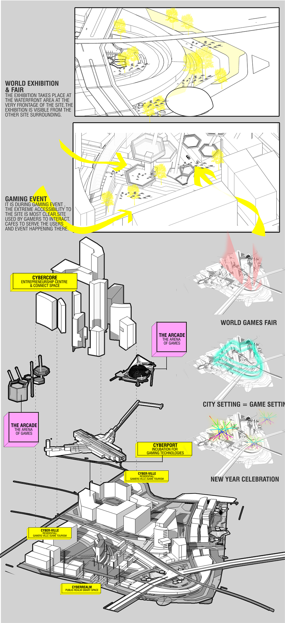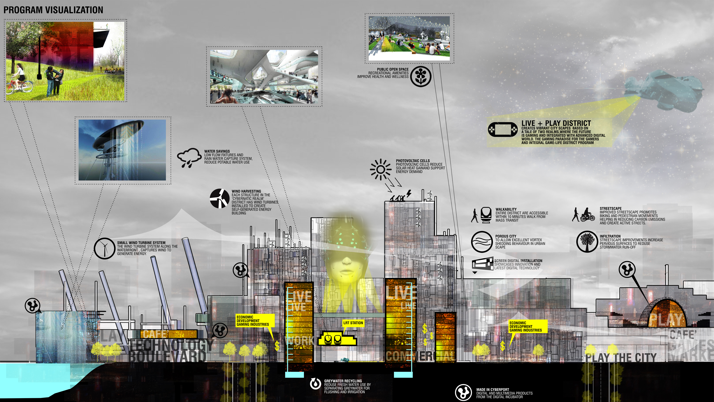 CYBERNETIC REAL(M) is an urban exercise emphasizing on the system of ‘the tale of two realms’ in which , it is a game city and at the same time the city is the game setting itself. As it is a projection of a 100 years project, the exercise emphasizing a lot in the advancement of digital technologies and cooperate it with city making, engaging people, security of the city and generating economy in Sentul. The gaming feature will become the urban tools in creating the city system.