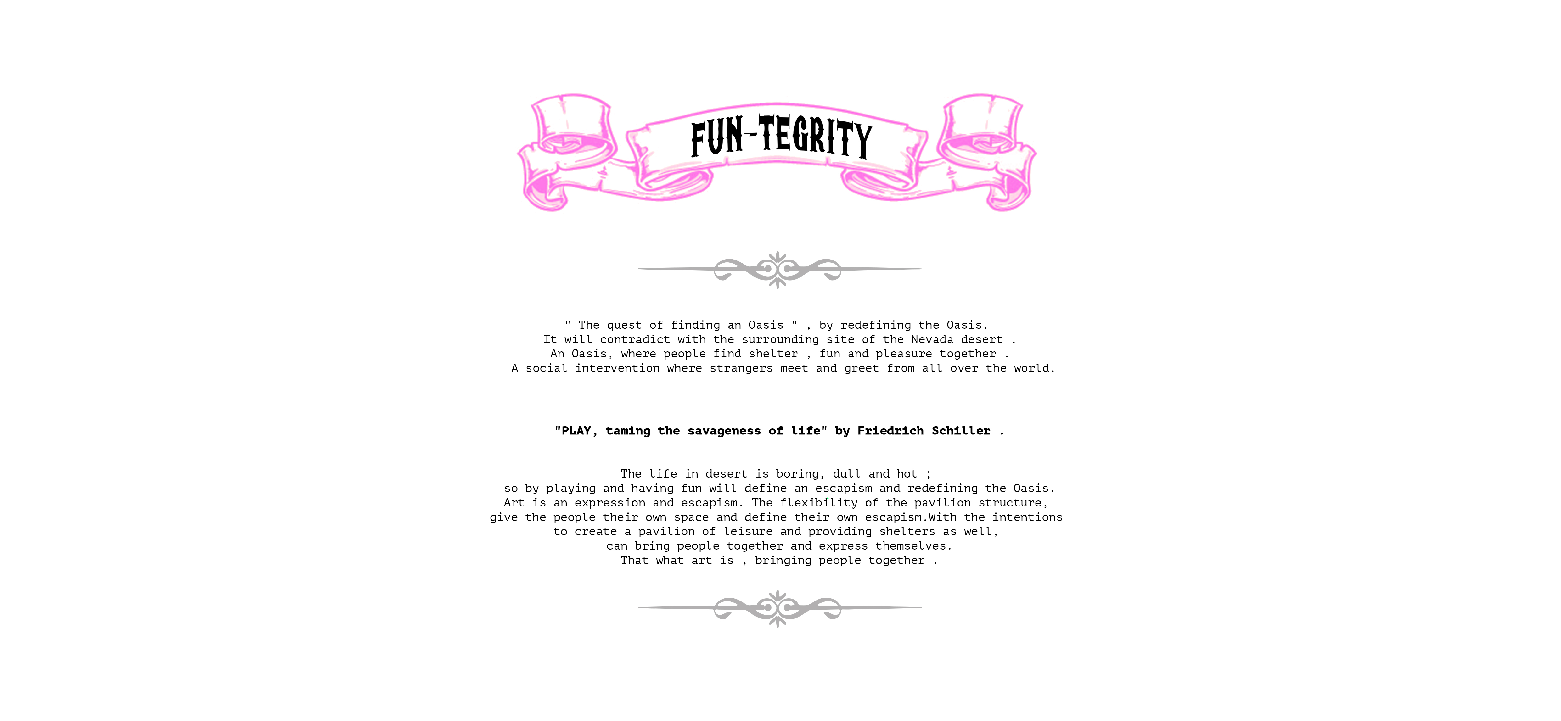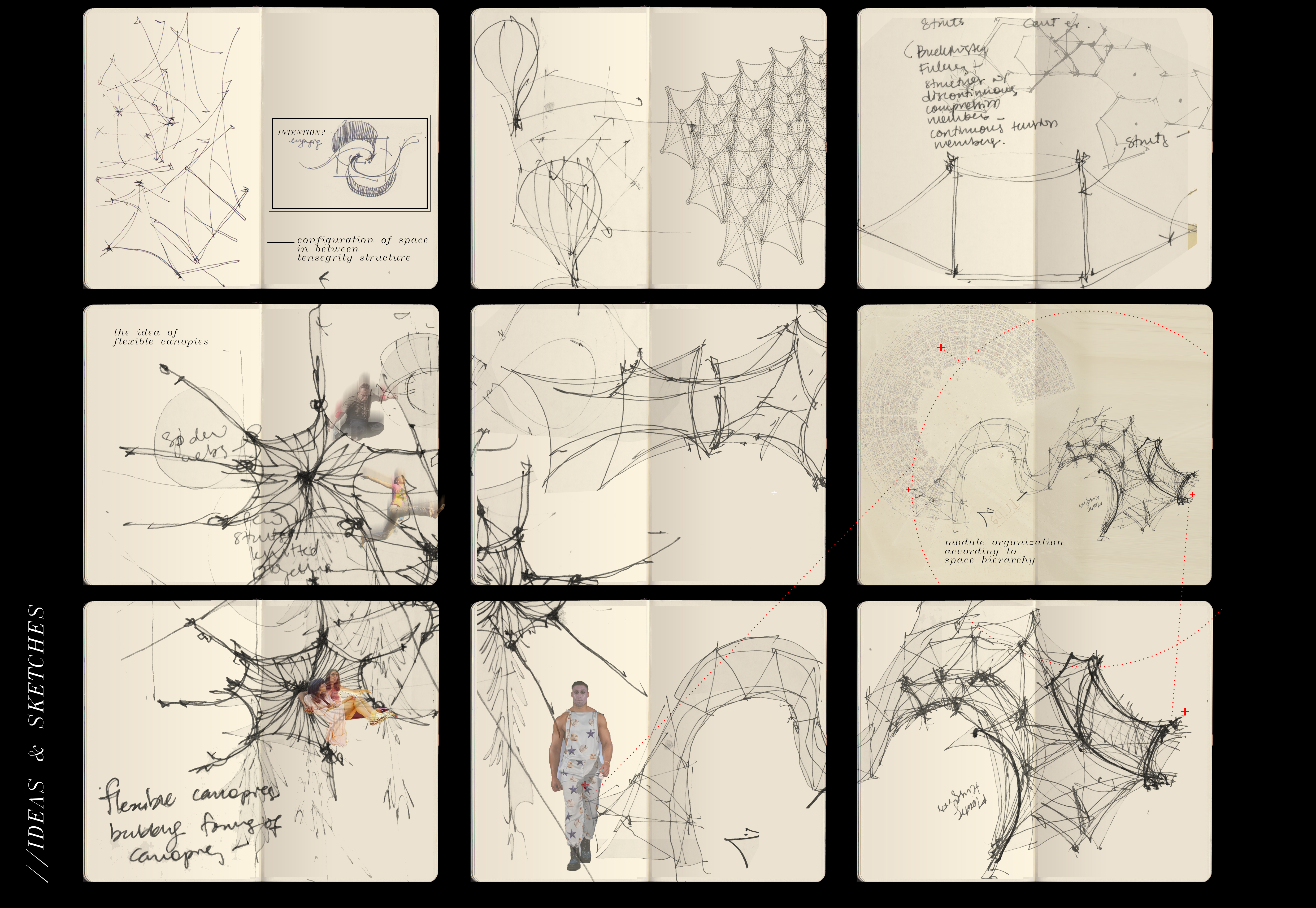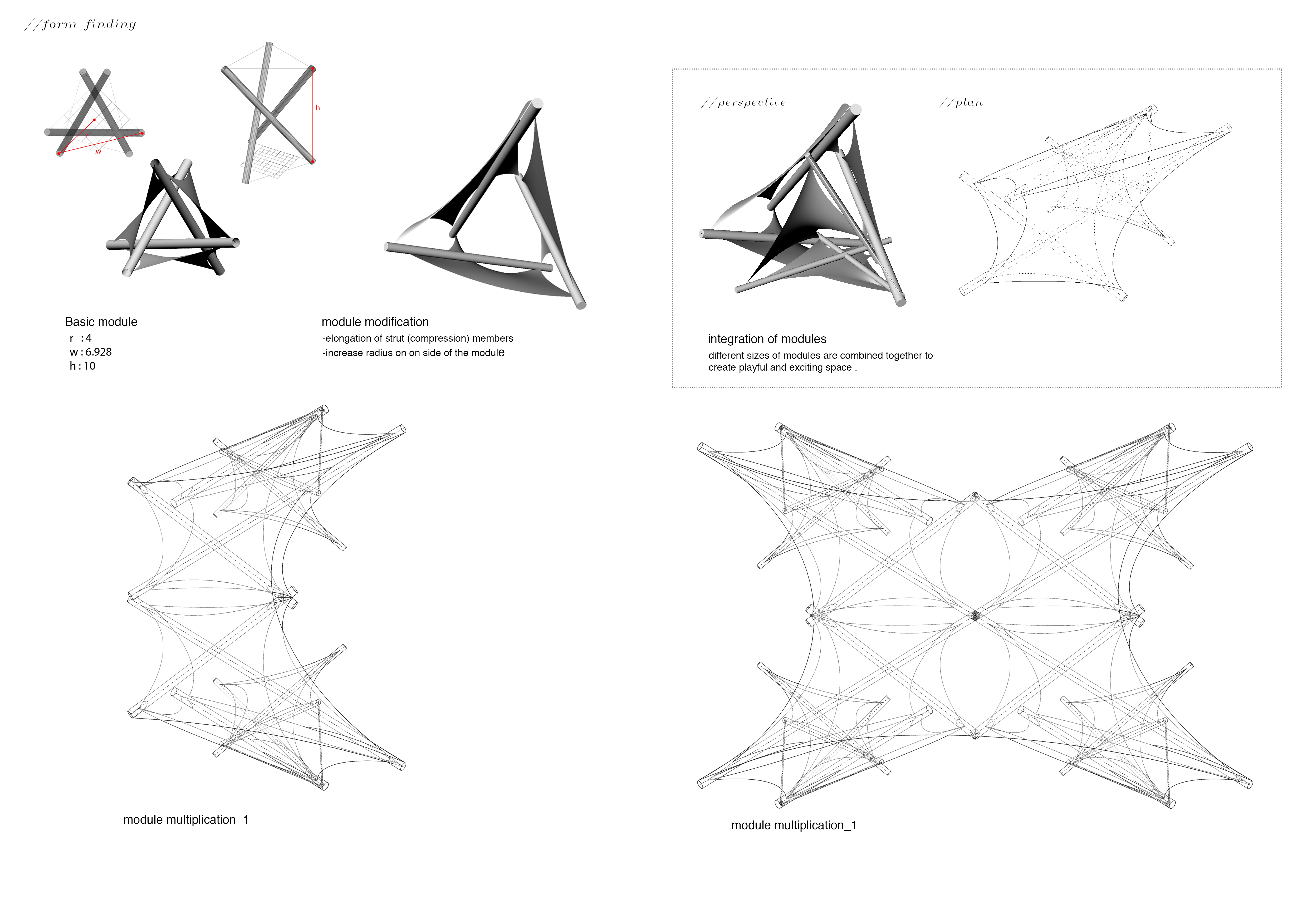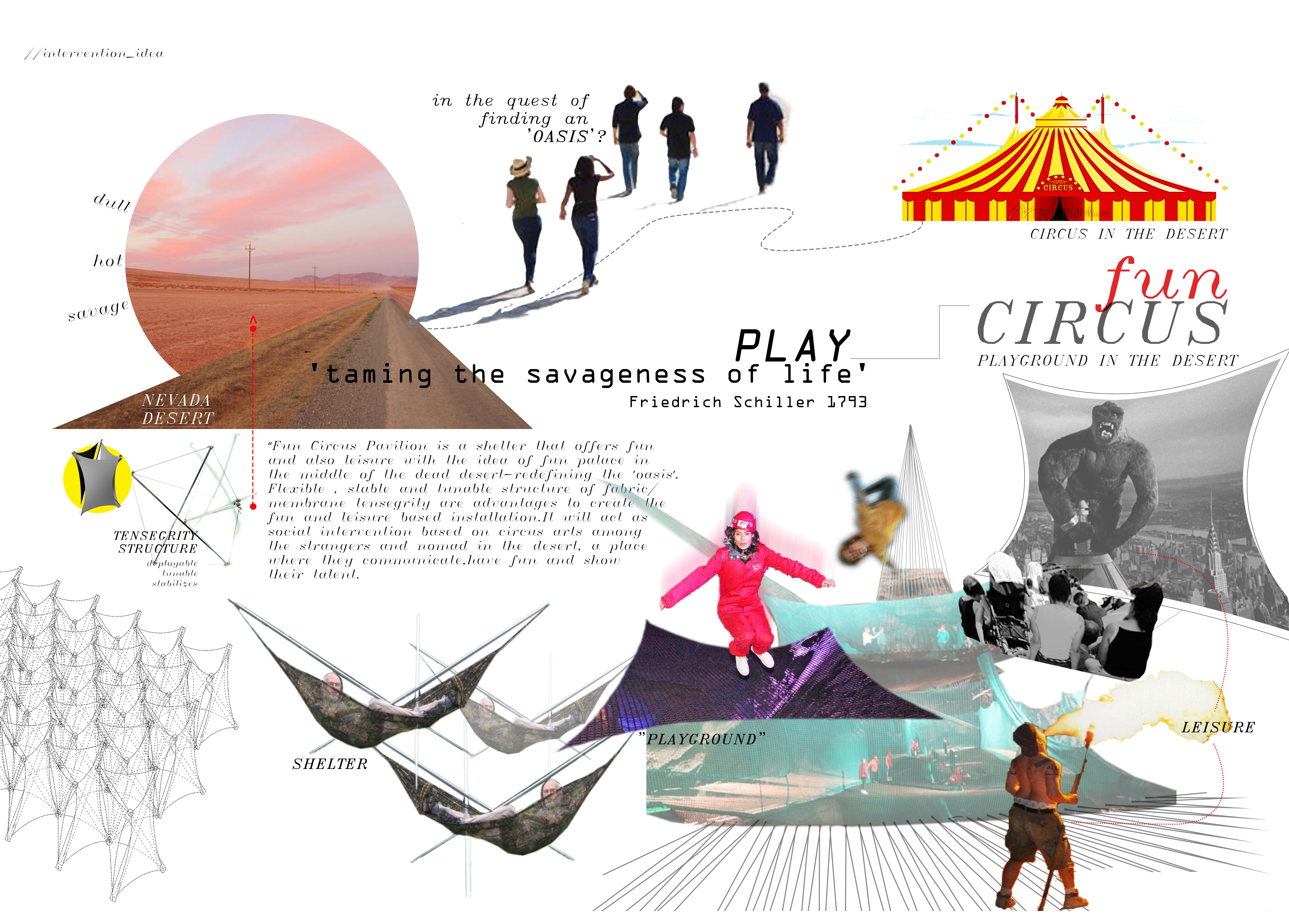 “All Structures, properly understand, from solar system to the atom, are tensegrity structures. Universe is omnitensional tensegrity”, Buckminster Fuller described the tensegrity structure. With the concept of “Fun Circus: Playground in the desert”, the Fun-tegrity Pavillion is a shelter that offers fun and also leisure with the idea of fun palace in the middle of the dead desert – redefining oasis. Flexible, stable and tuneable of membrane tensegrity are advantages to create the fun and leisure based installation and give more means rather than only harps in spaces. The pavilion will capture the essence of dynamic characteristics of the tensegrity structures, by decomposing and altering the basic module of the tensegrity model. This pavilion will has three main functions, which are for shelter, leisure and as a playground . The membrane of the structure will provide shelter from the hot burning sun , and in between the poles of the compression members, hammocks can be installed to provide individual leisure space. On top of the modules combined , there’ll be a trampoline installation, as the playground, where people can jump on it .