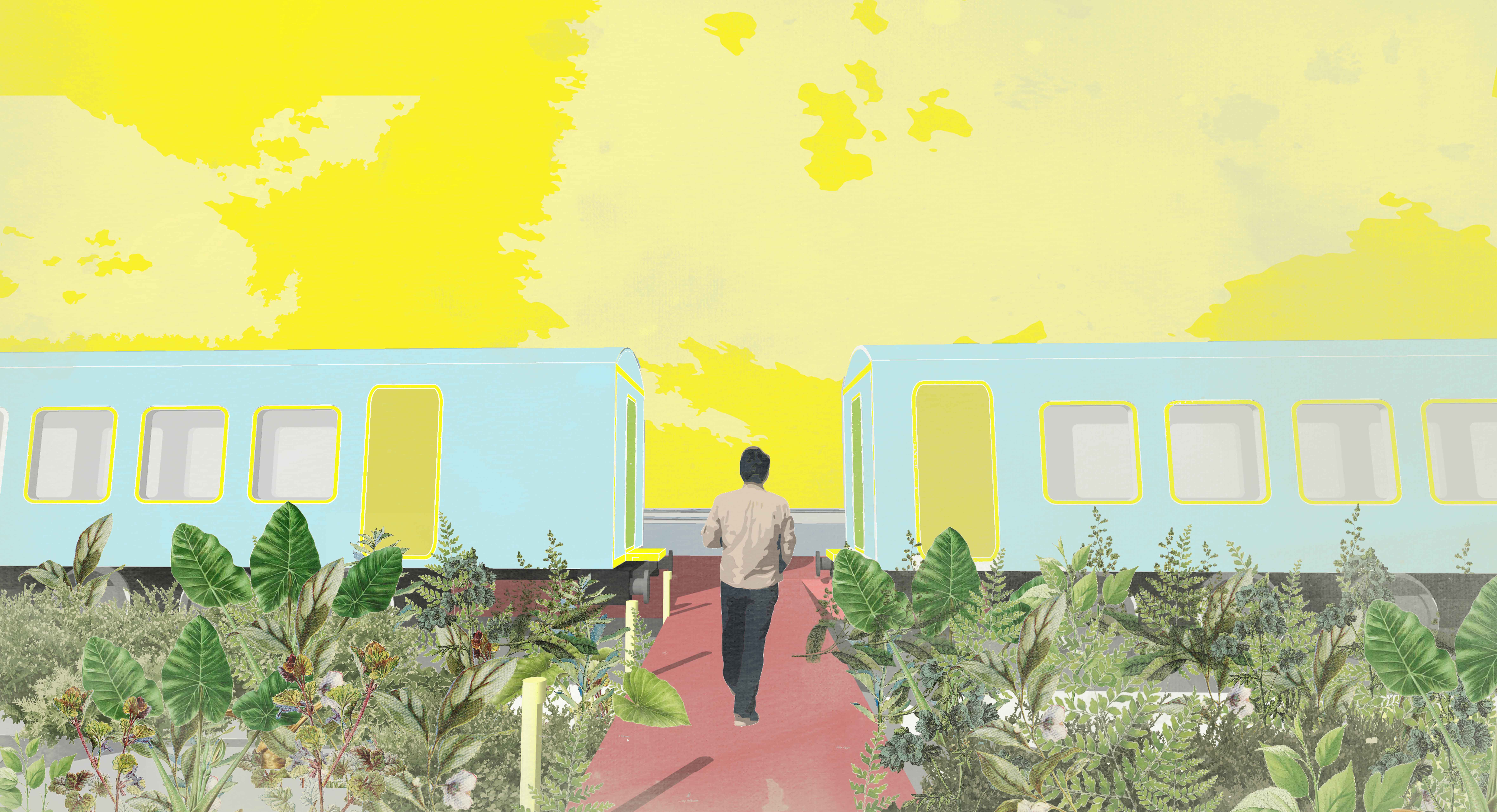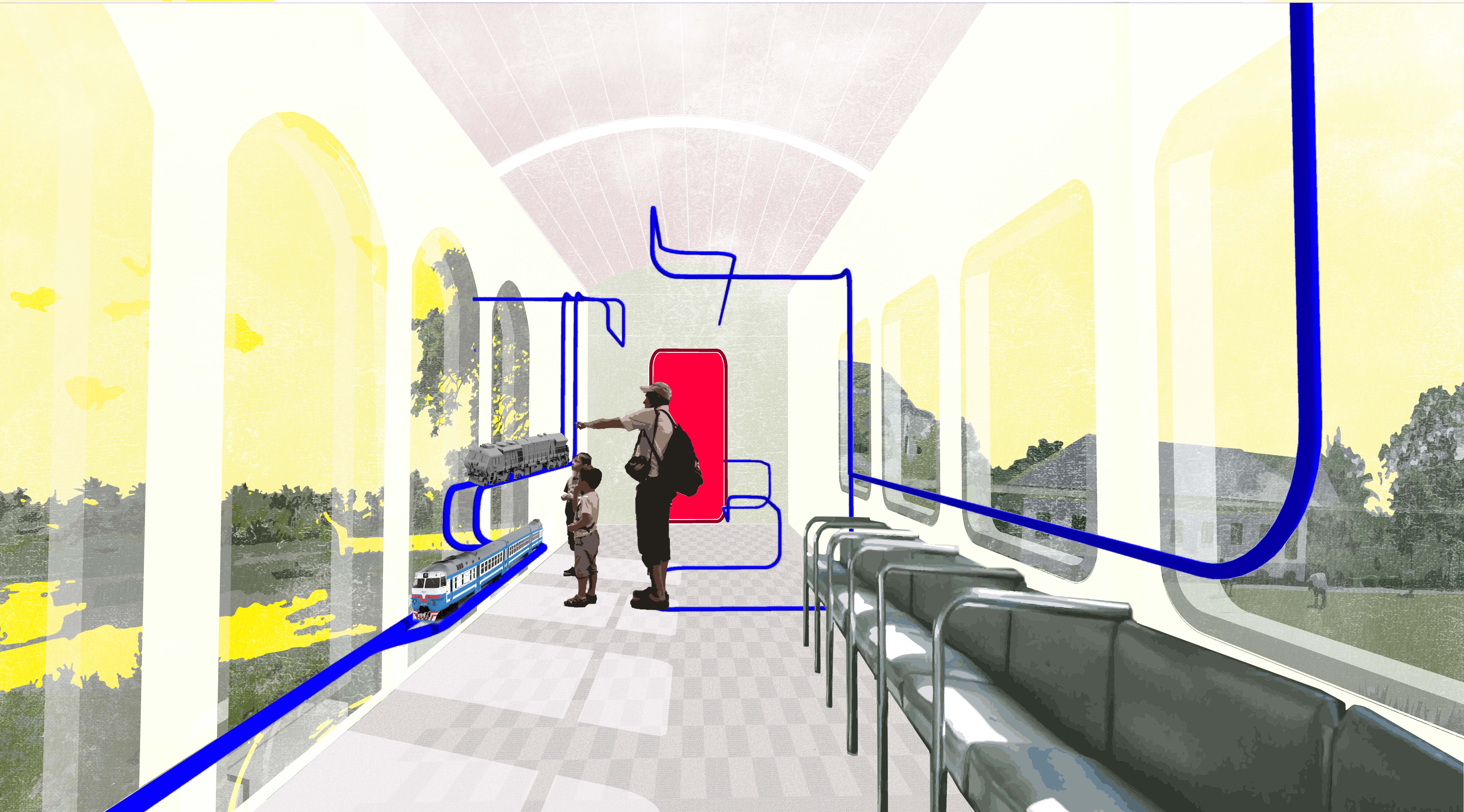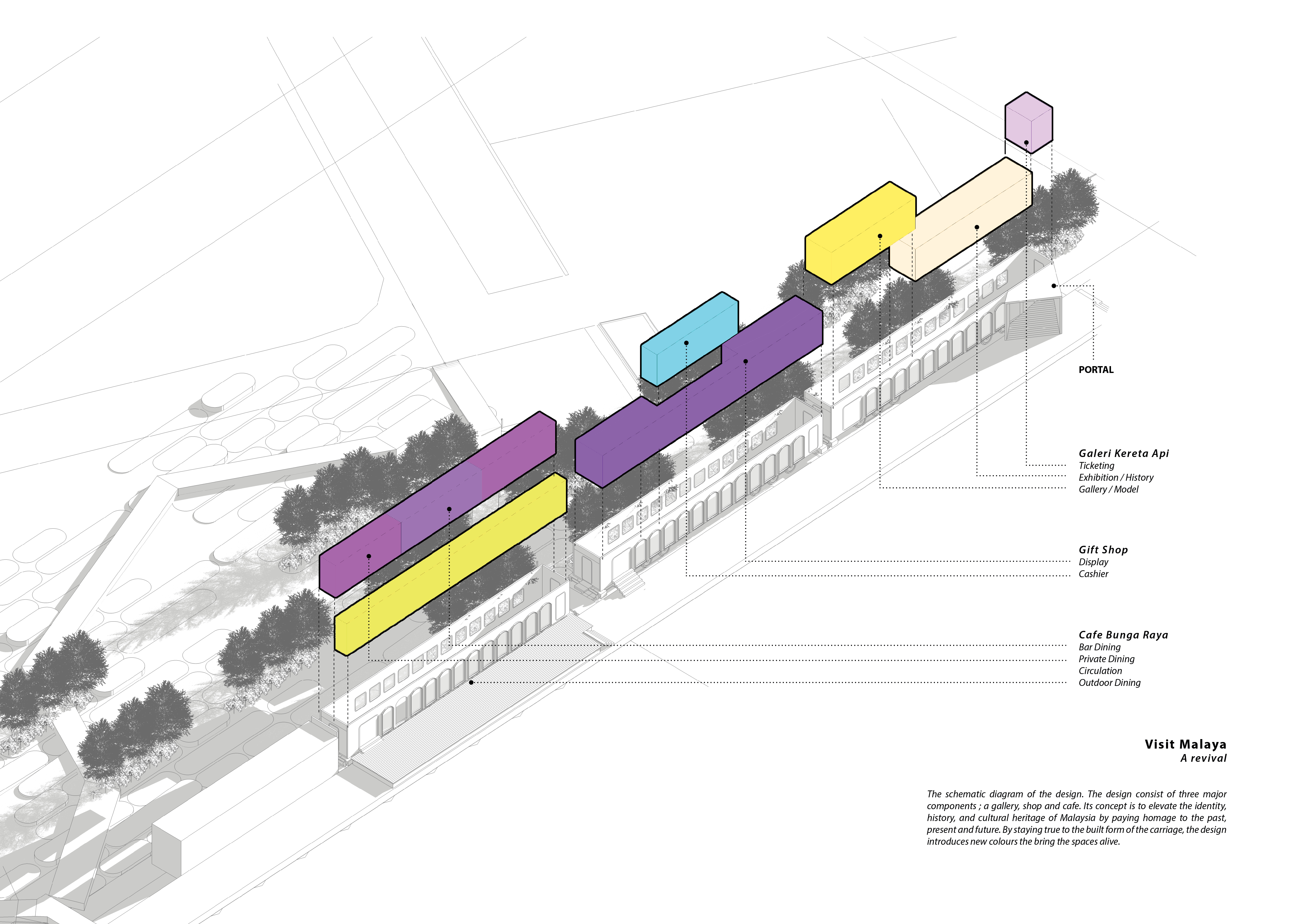 Back in time , travelling on a train was an exquisite and exotic journey . Over the years , this experience is forgotten and this proposal remains pure and true to its original form, reviving the coaches to their former glory days by enhancing pops of colours. The design is to elevate the identity, history and cultural heritage of trains in Malaysia by paying homage to the past, present and future.