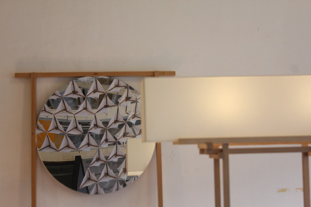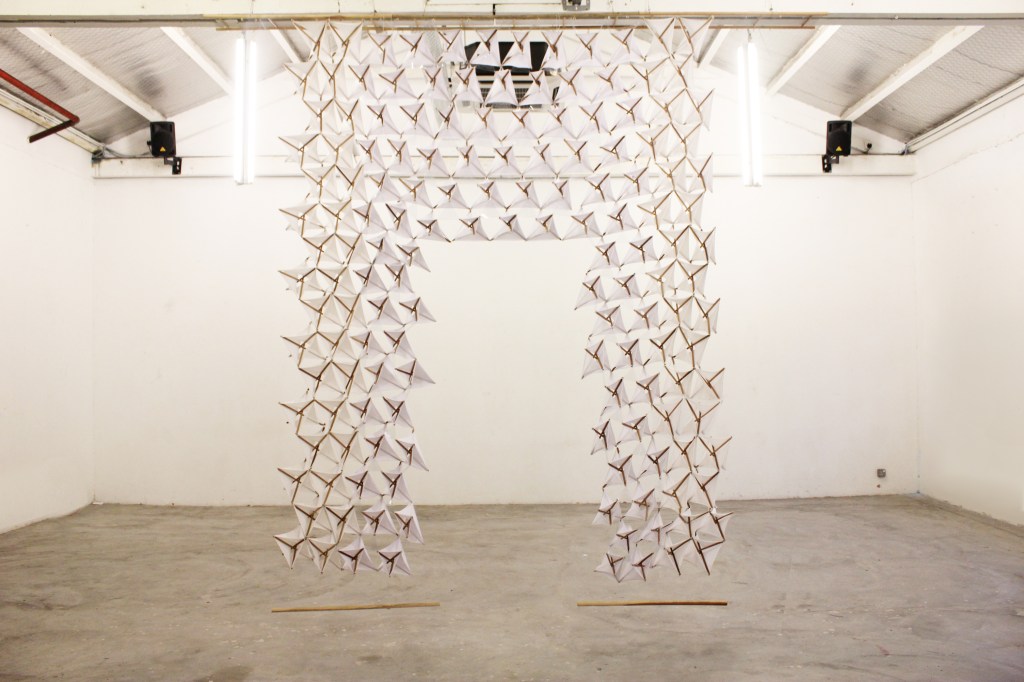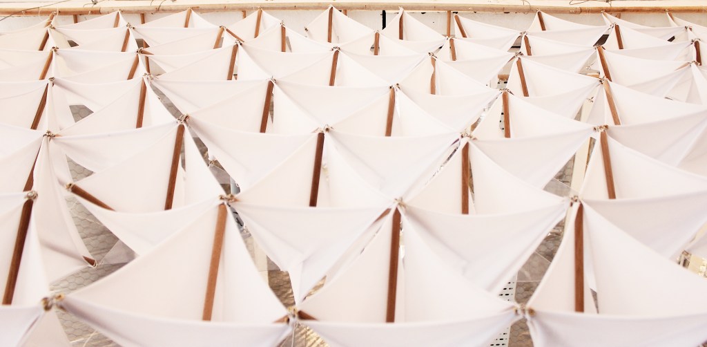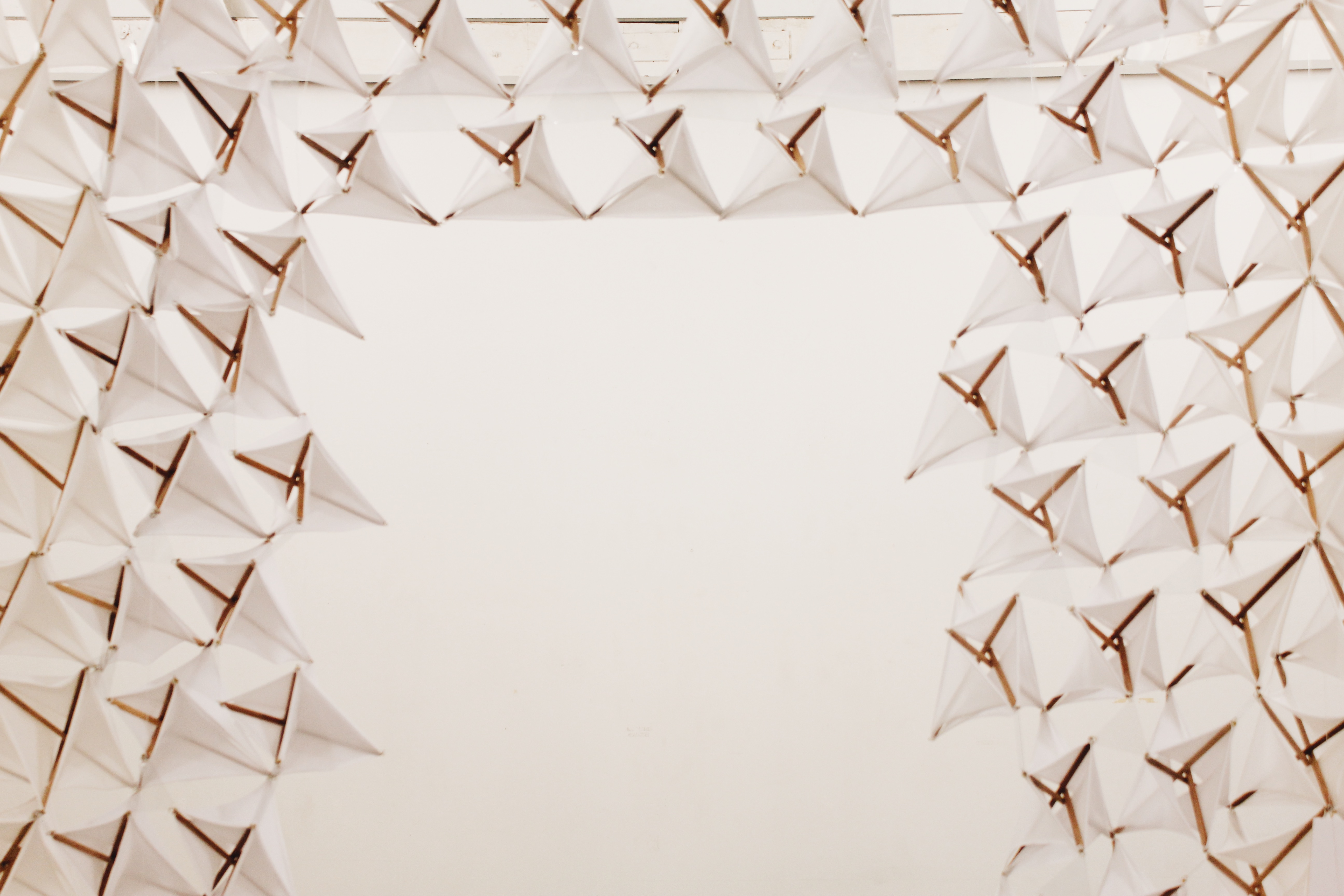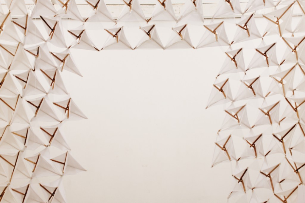 Using basic tensegrity module of 3 struts, the tensional components were explored both using cables and fabric. The fabric helps in creating enclosures whilst maintaining its tensional property. The Tensegrity Wall/flower is designed to create a slight ambiguity of space through manipulating the enclosures of fabric tensegrity components.