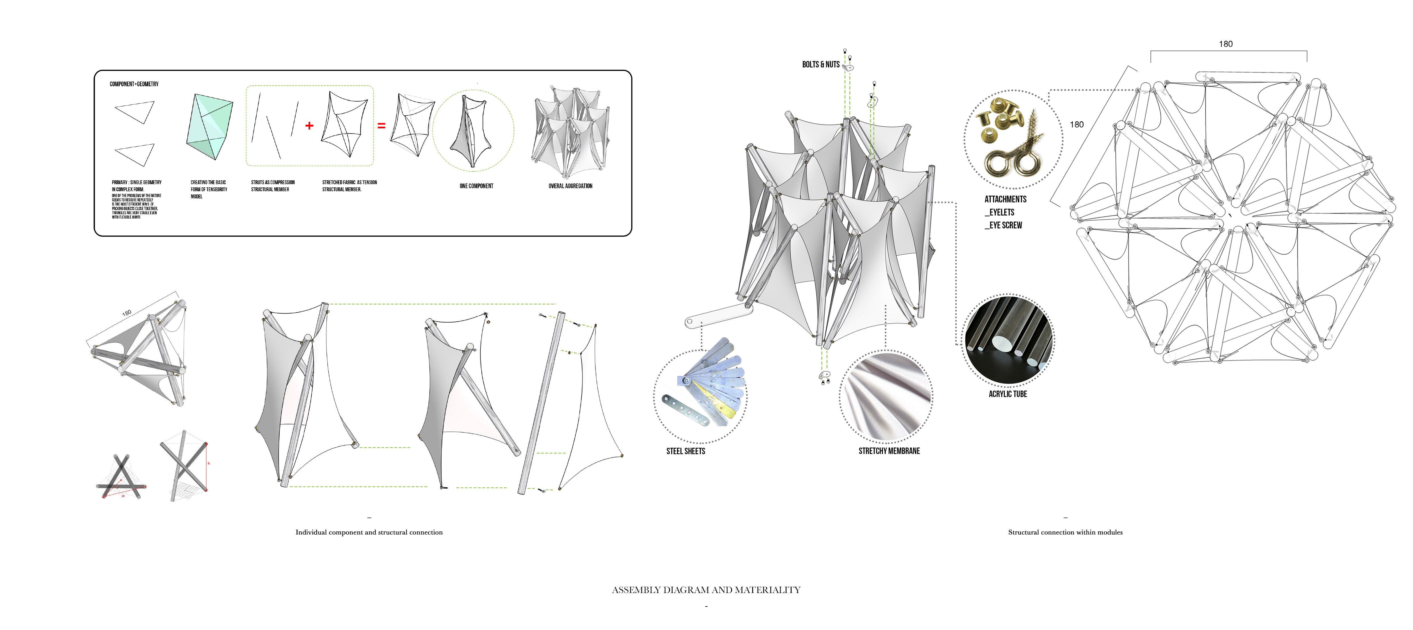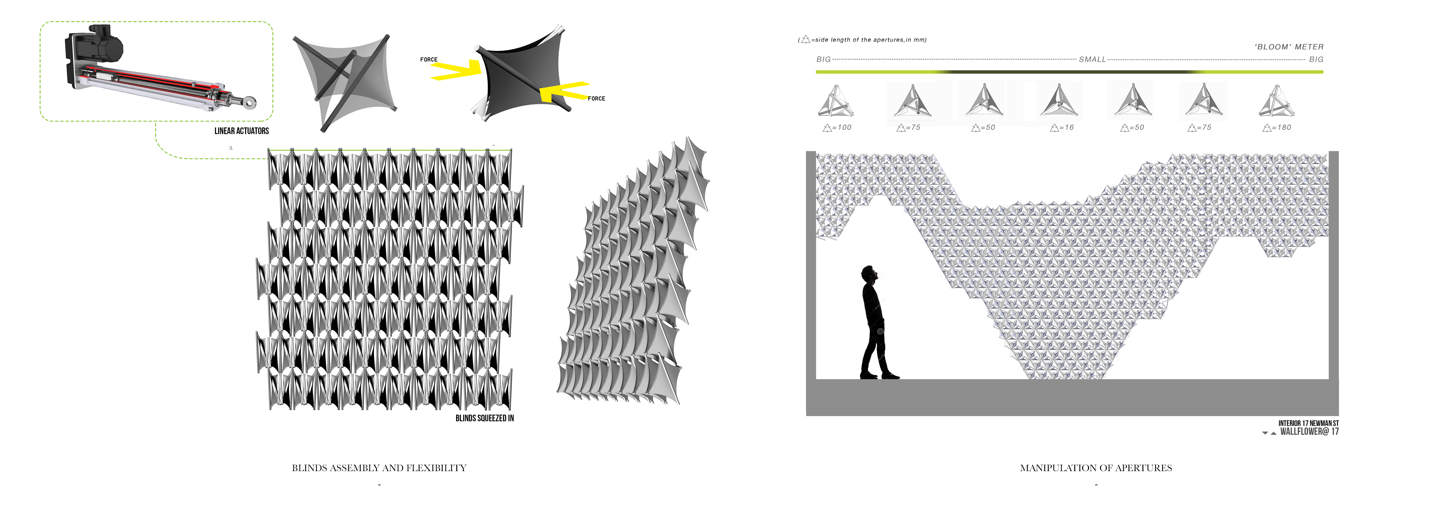 The idea of incorporating tensegrity structures into the installation for Buro Happold are to manifest the integrity between stability and flexibility of the system into the ‘sculpture’. The Tensegrity Wall/flower is designed responding to privacy and weather – through enclosure manipulation of every cells of tensegrity component.