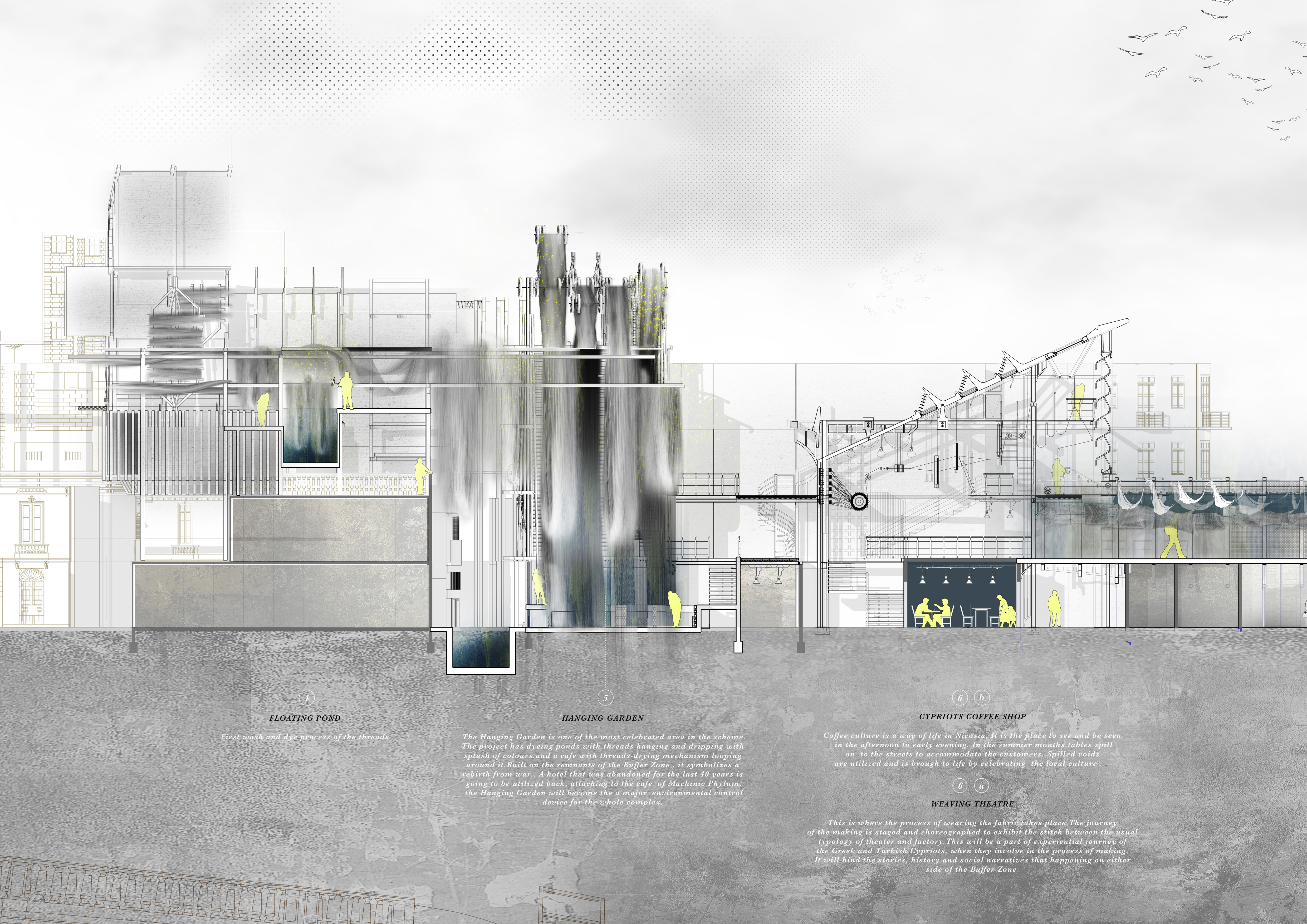 The complex acts as the stage of Cypriots textile production where the spaces will stage and choreograph the whole production of textile making, from fibre collection to dyeing the threads and weaving the Fabrics of Memory.